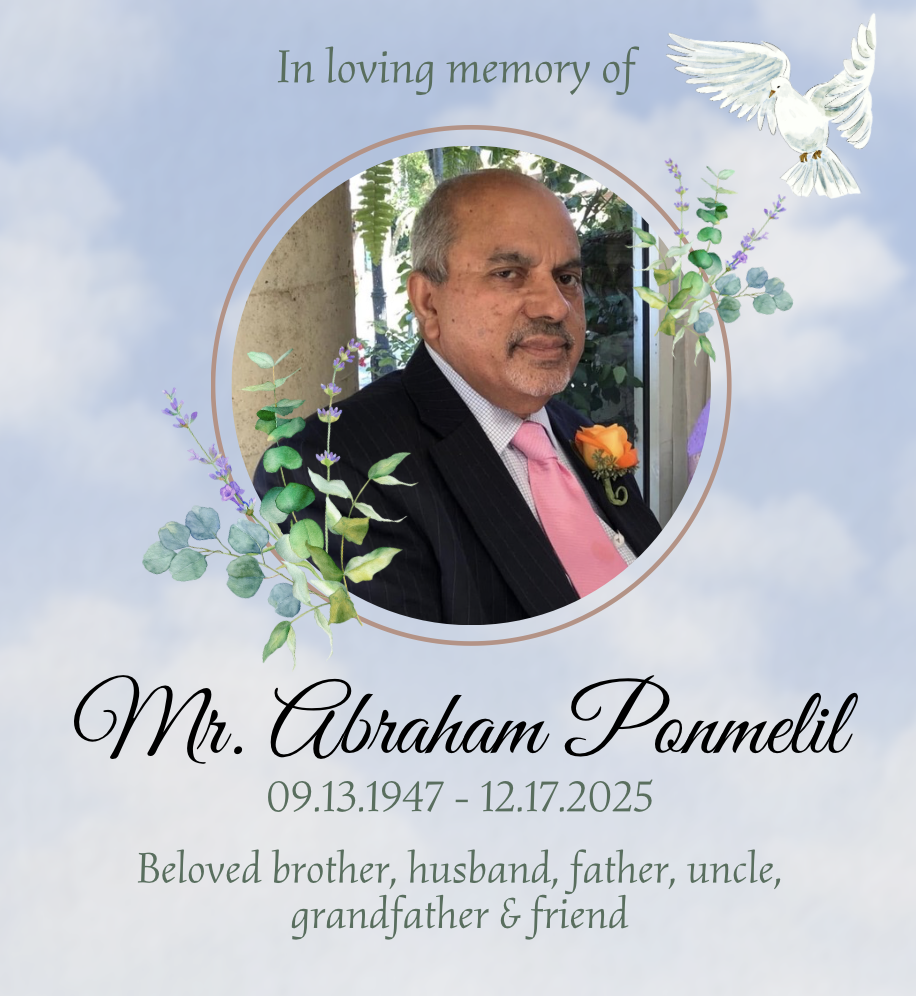 Our very own, Abraham Ponmelil (Kunjumon), age 78, of Bergenfield, New Jersey passed away on Wednesday, December 17th, 2025. The St. Peter’s parish family sends our condolences to his family and friends. May his soul rest in peace with the Lord.
